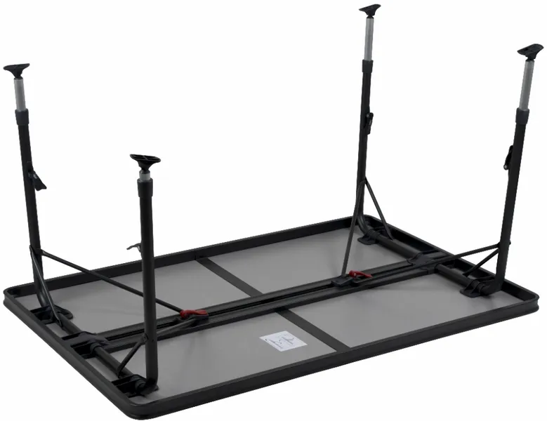 De tafelpoten zijn traploos in hoogte te verstellen. Door deze optie zorg je ervoor dat de tafel altijd precies bij de hoogte van jouw stoelen past. Bovendien zijn er stabilisatoren bevestigd onder de verstelbare poten die ervoor zorgen dat deze tafel op iedere ondergrond stabiel staat. Binnen no-time zet jij de Crespo campingtafel op!