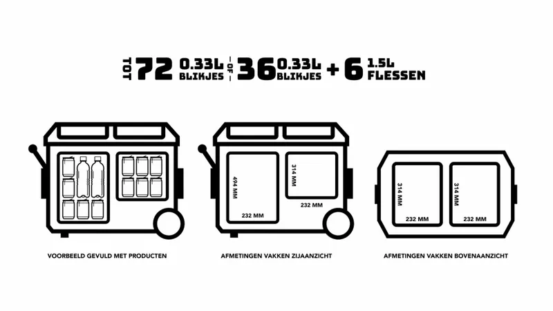 | Binnenmaat koelbox | Compartiment 1: 31 x 23 x 49 cm, Compartiment 2: 31 x 23 x 31 cm | |