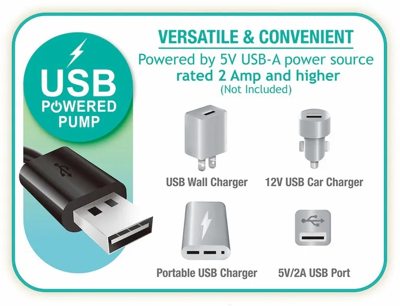 De elektrische luchtpomp met USB ingang zorgt ervoor dat het opblazen en leeg laten lopen van je luchtbed een eitje is. Sluit hem aan op stroom en binnen 4 minuten staat je slaapplek al overeind! De lader kun je aansluiten op alle 5V USB stroombronnen van 2 Ampère en hoger. Inclusief telefoonladers, 12V autoladers of draagbare powerbanks.